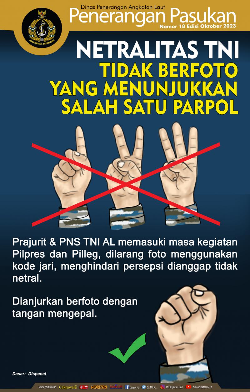 - Netralitas TNI, Tidak berfoto yang menunjukkan salah satu Parpol Nomor 18 Edisi Oktober 2023