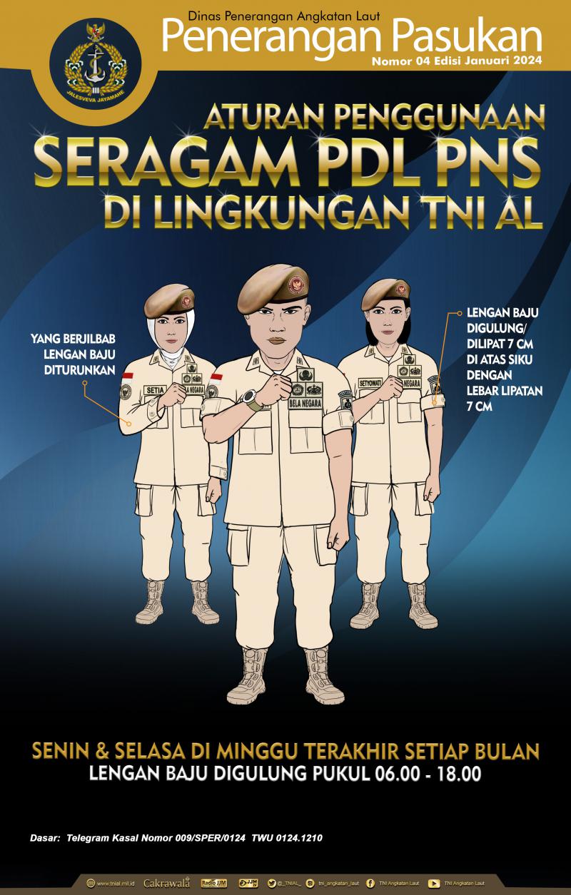 - Aturan Penggunaan Seragam PDL PNS dilingkungan TNI AL Nomor 04 Edisi Januari 2023